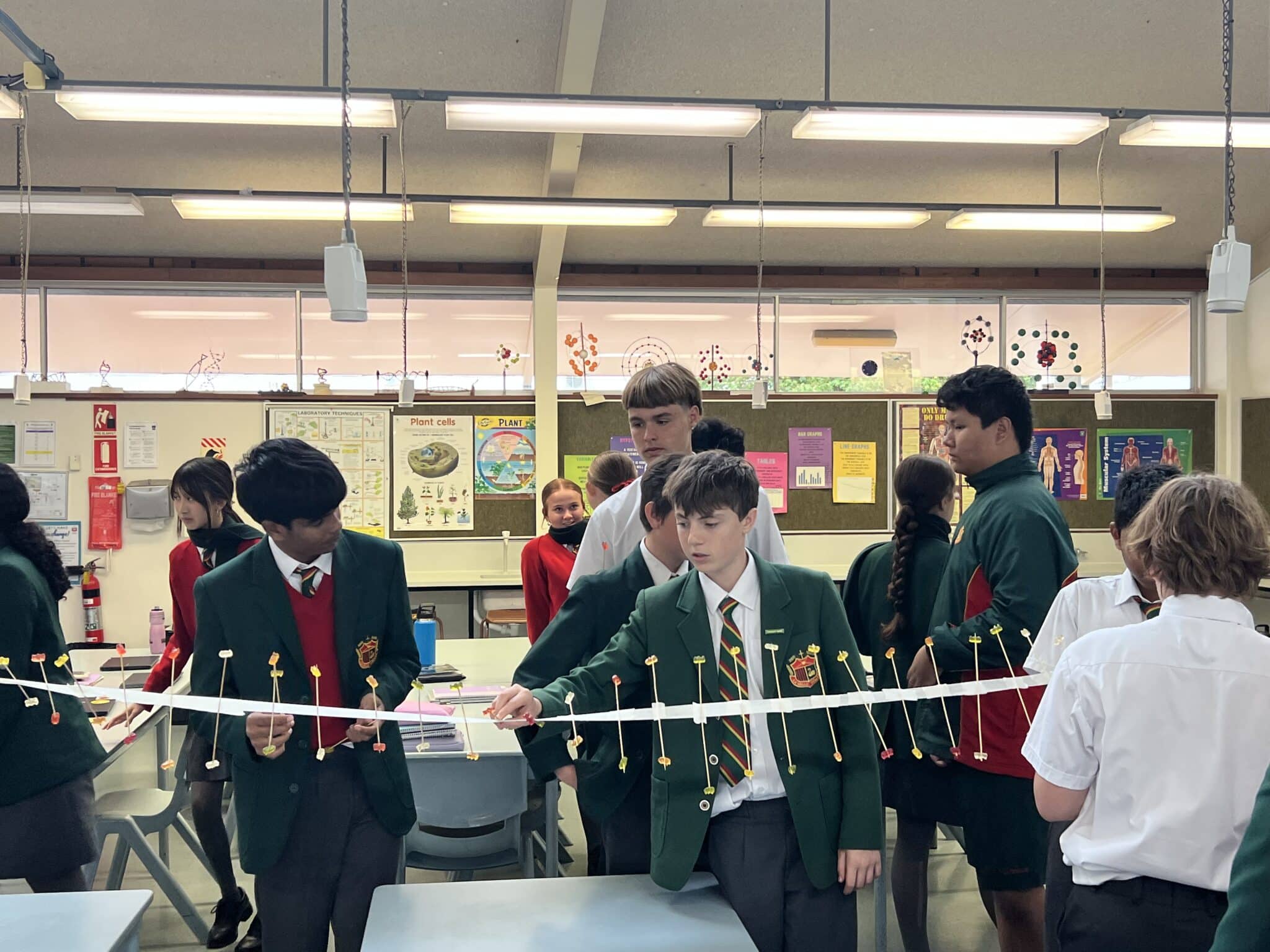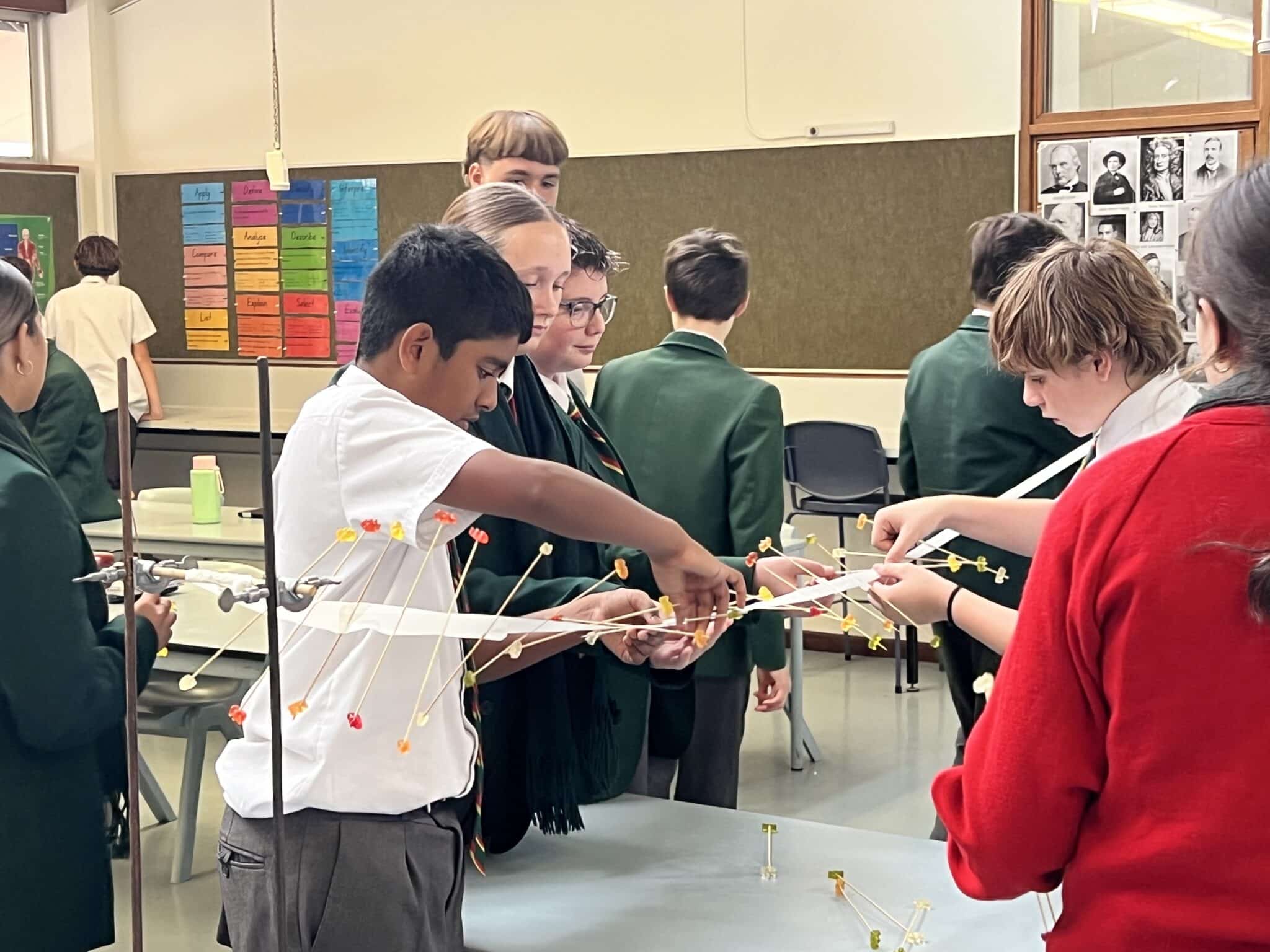 Students also studied examples of ‘longitudinal’ waves which include sound waves and ultrasounds. After creating a class ‘wave machine’ using skewers and jelly babies, students were able to increase the wavelength, frequency as well as speed. It was a great way to delve into the physics curriculum with a very sweet hands-on task. Click here to watch the experiment unfold.Â